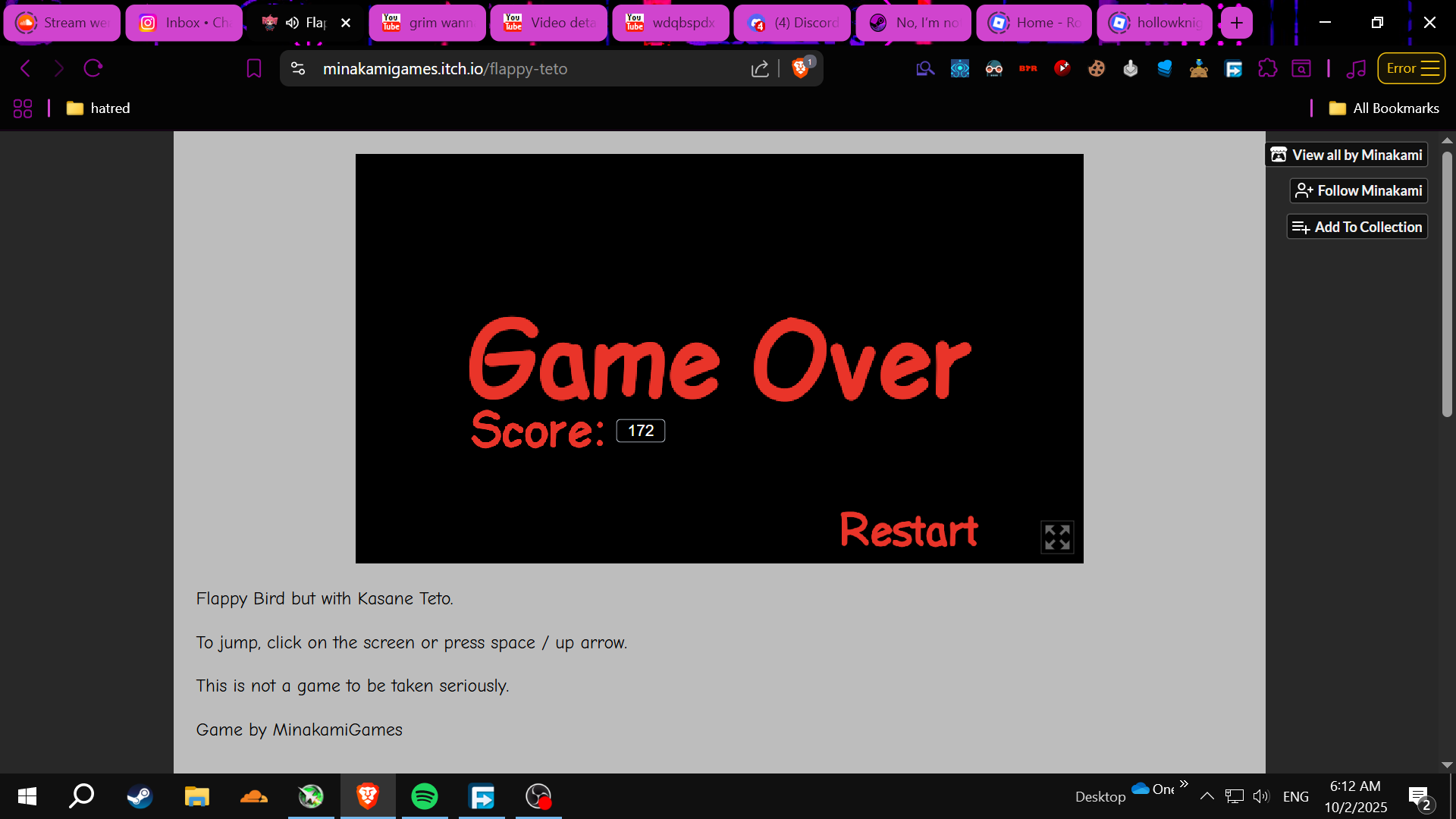 Hey, thanks for the feedback! I've added a proper hitbox for Teto and spaced the obstacles a bit further apart to make the game more fair. I hope the gameplay has improved a bit :)